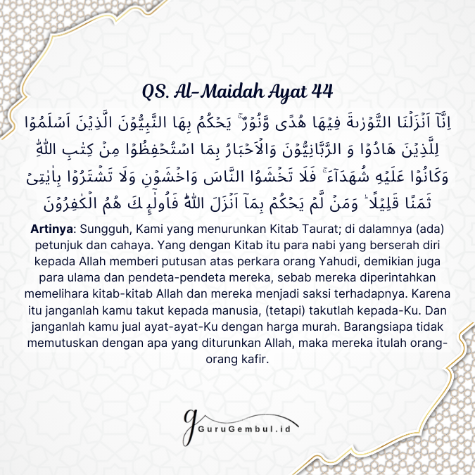 Artinya: Sungguh, Kami yang menurunkan Kitab Taurat; di dalamnya (ada) petunjuk dan cahaya. Yang dengan Kitab itu para nabi yang berserah diri kepada Allah memberi putusan atas perkara orang Yahudi, demikian juga para ulama dan pendeta-pendeta mereka, sebab mereka diperintahkan memelihara kitab-kitab Allah dan mereka menjadi saksi terhadapnya. Karena itu janganlah kamu takut kepada manusia, (tetapi) takutlah kepada-Ku. Dan janganlah kamu jual ayat-ayat-Ku dengan harga murah. Barangsiapa tidak memutuskan dengan apa yang diturunkan Allah, maka mereka itulah orang-orang kafir.